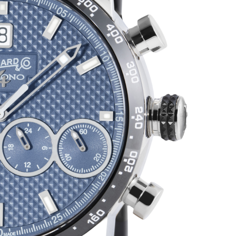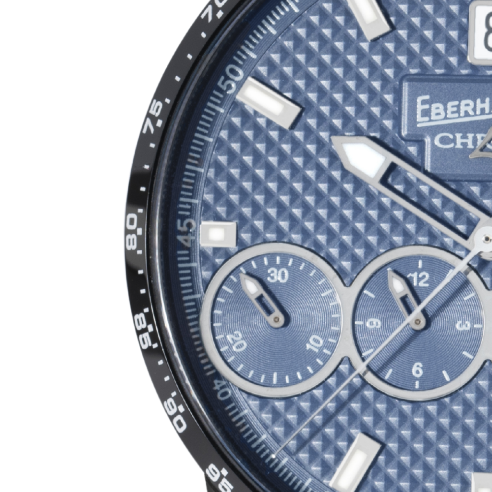 BLUE-GRAY DIAL WITH 4 BLUE-GRAY COUNTERS FEATURING “AZURÉE” FINISHING AND POLISHED APPLIED PROFILE. CENTRAL AREA FEATURING “CLOUS DE PARIS“ FINISHING, PERIMETER AREA WITH AZURÉE” FINISHING AND MINUTE SCALE FEATURING 1/5 SECOND MARKINGS.