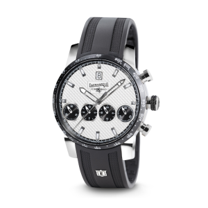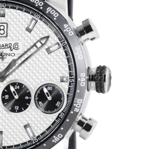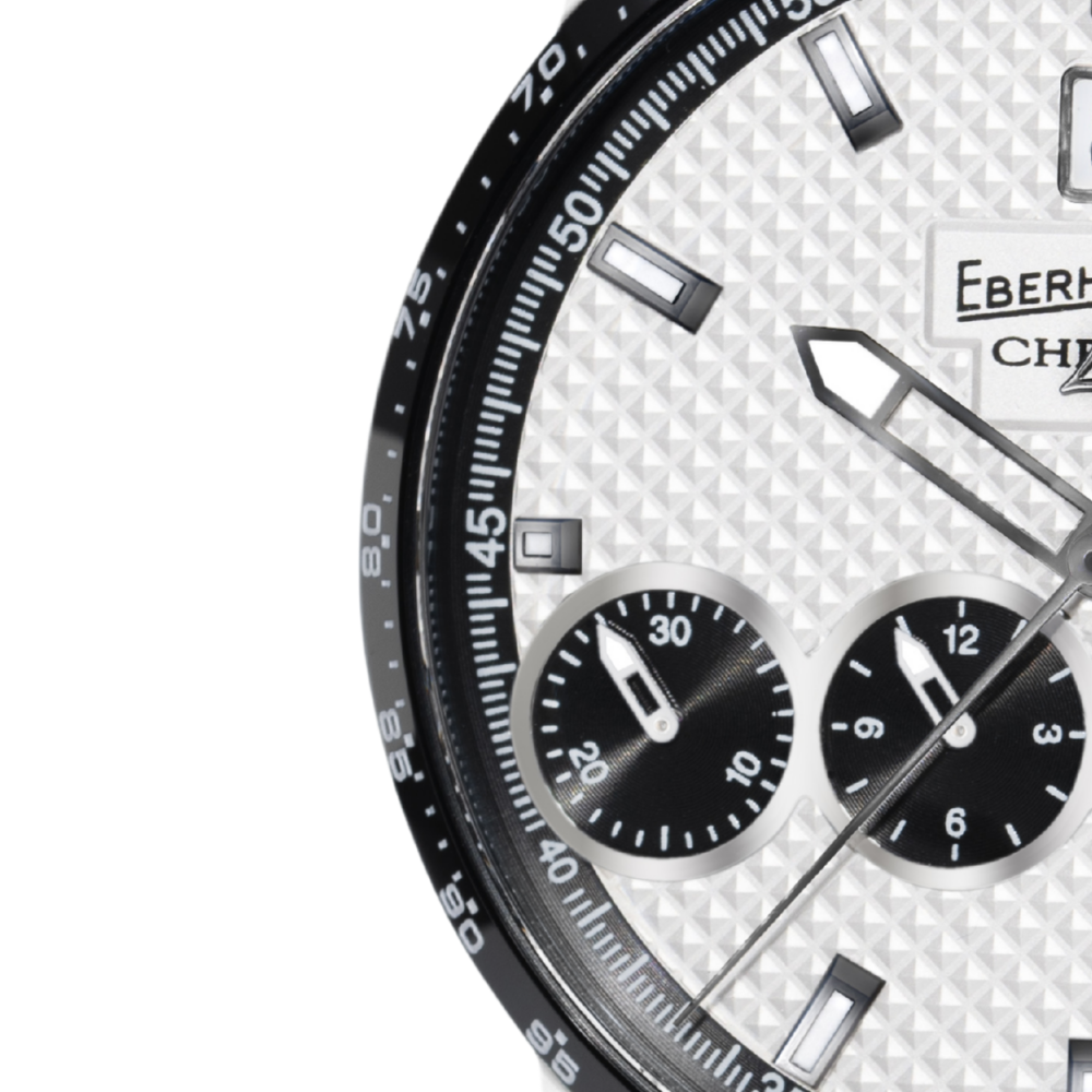 WHITE DIAL WITH 4 BLACK COUNTERS FEATURING “AZURÉE” FINISHING AND POLISHED APPLIED PROFILE. CENTRAL AREA FEATURING “CLOUS DE PARIS“ FINISHING, PERIMETER AREA WITH “AZURÉE” FINISHING AND MINUTE SCALE FEATURING 1/5 SECOND MARKINGS.