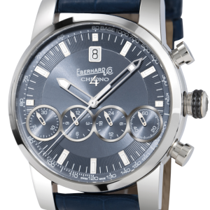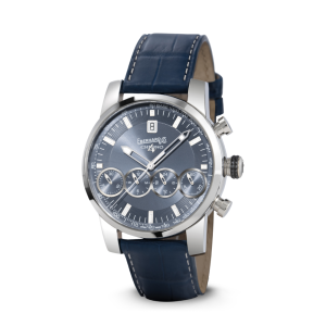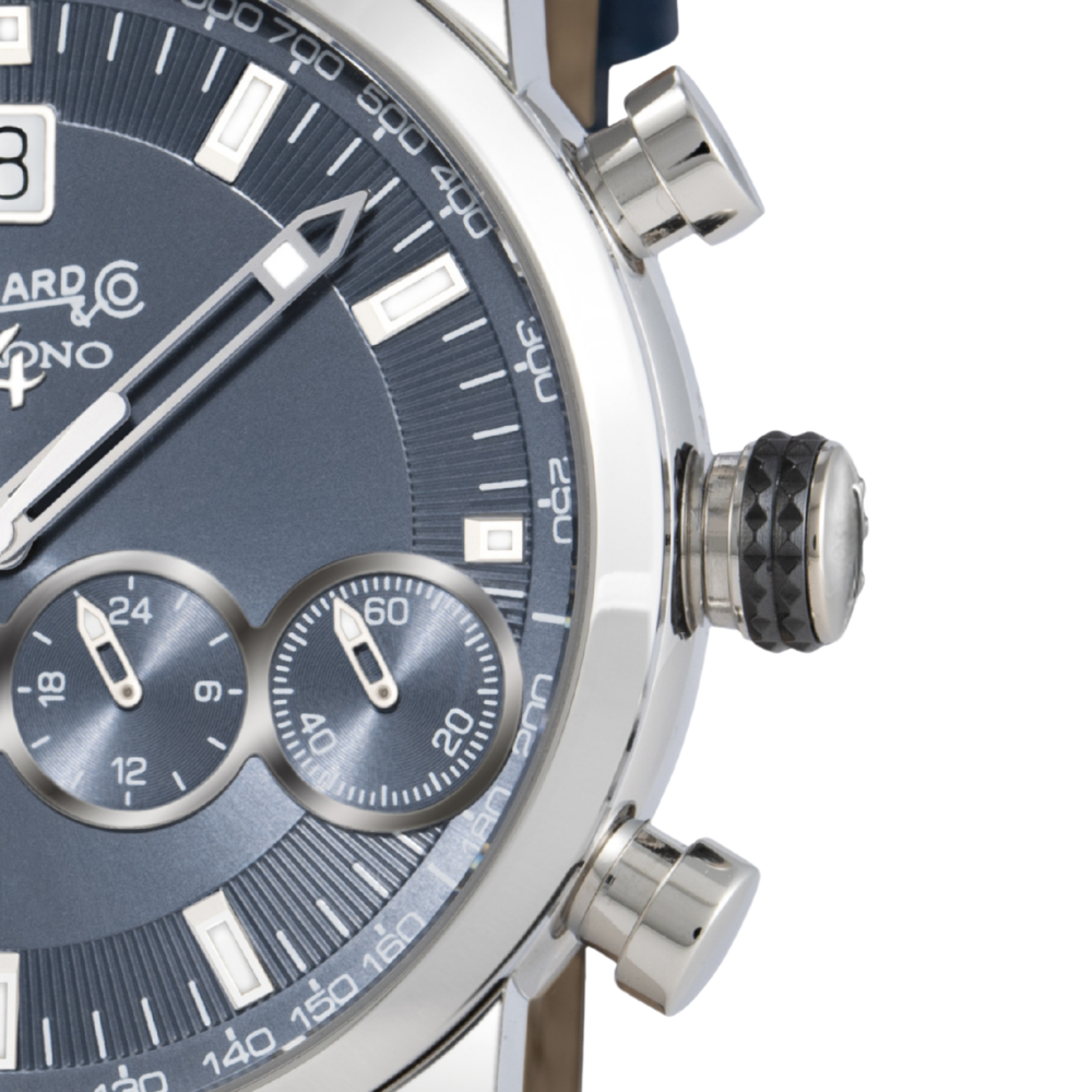 BLUE-GRAY DIAL WITH 4 BLUE-GRAY COUNTERS FEATURING “AZURÉE” FINISHING AND POLISHED APPLIED PROFILE. CENTRAL AREA FEATURING “SOLEIL“ FINISHING, AREA BELOW THE APPLIED INDICES WITH FINELY RADIUS-HEWN WORKING. APPLIED CARVED LUMINESCENT HOUR MARKERS. TACHYMETER SCALE ON BASE 1000.