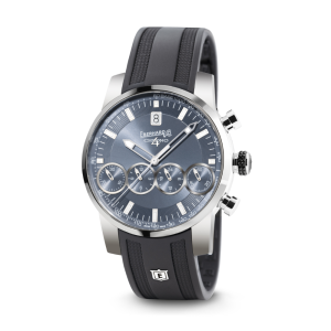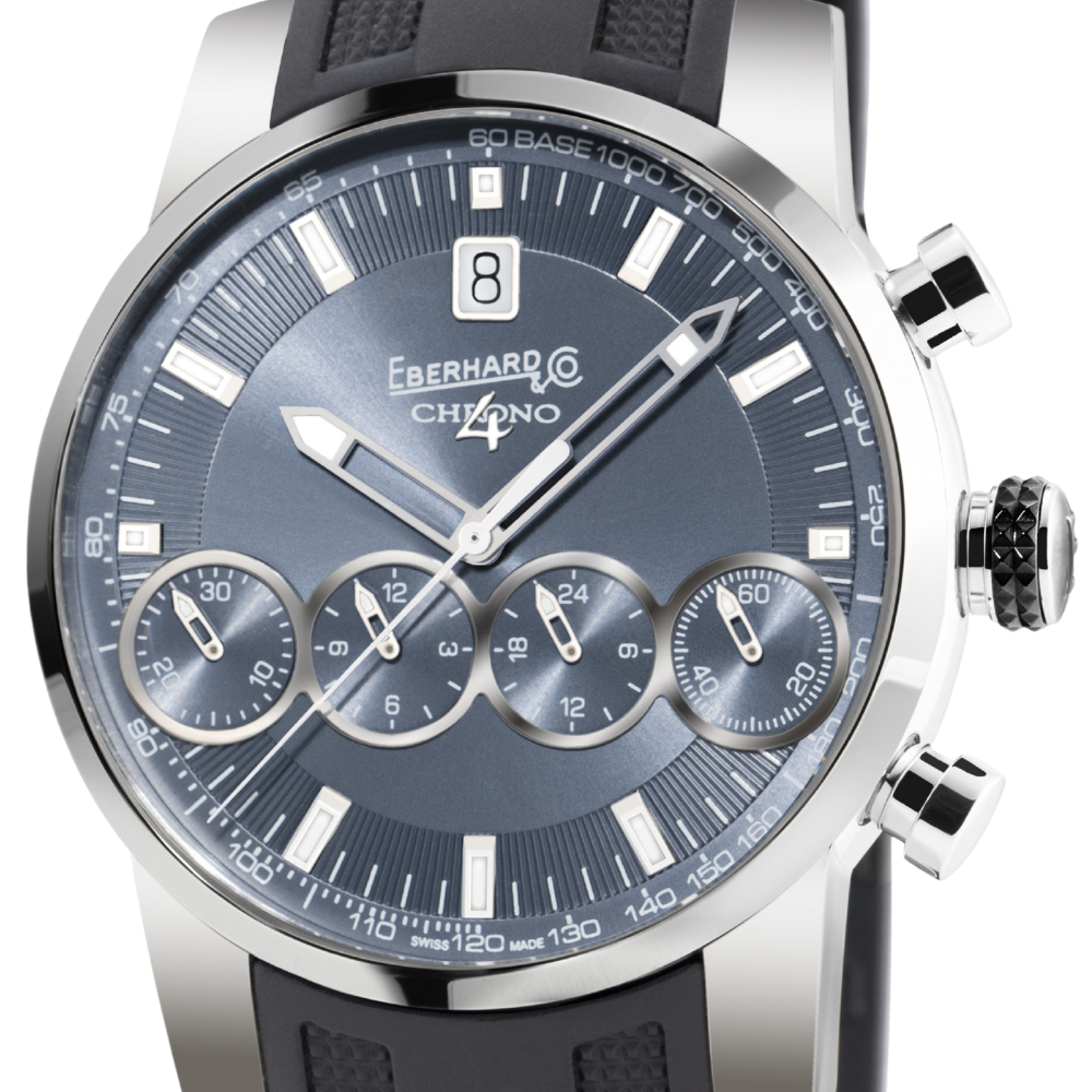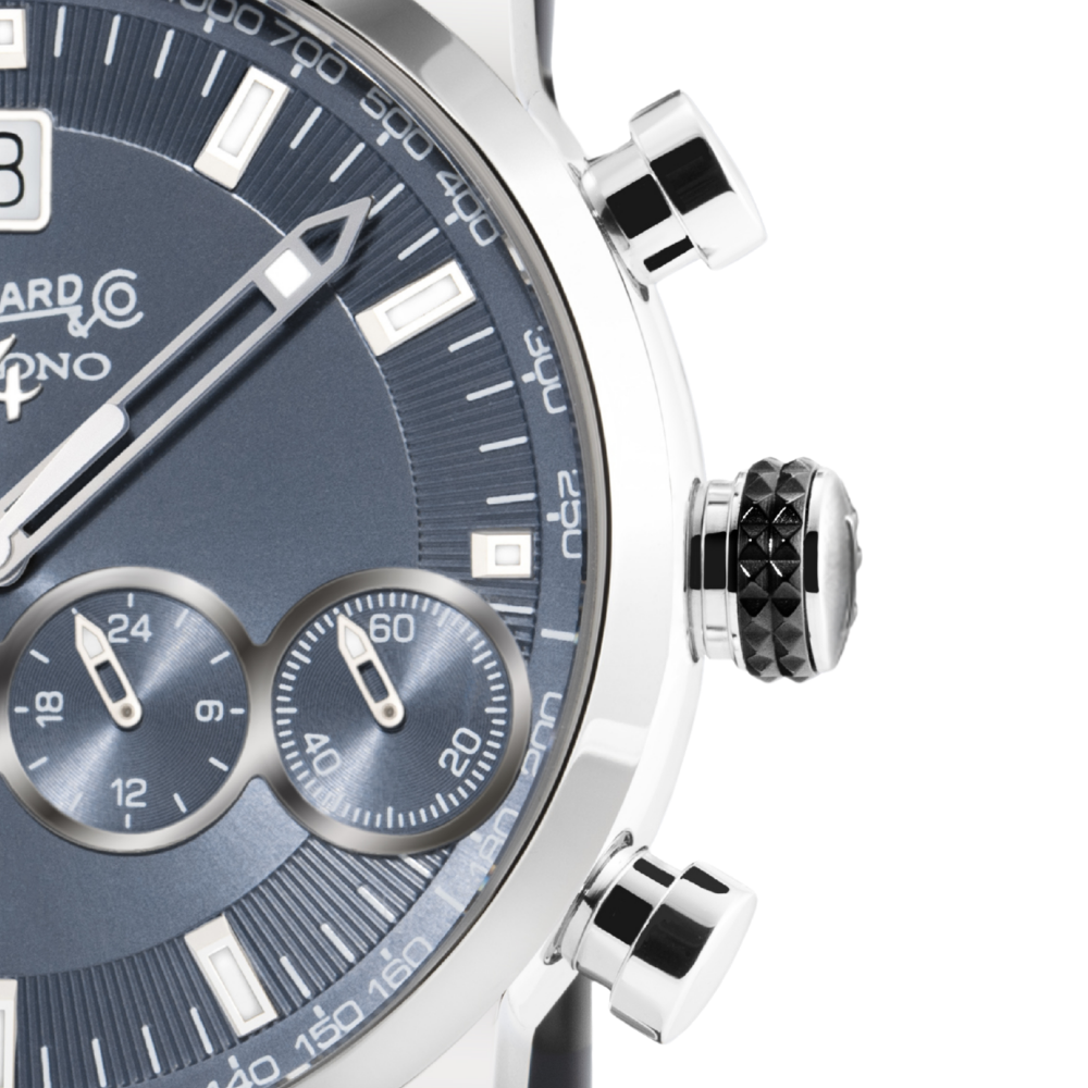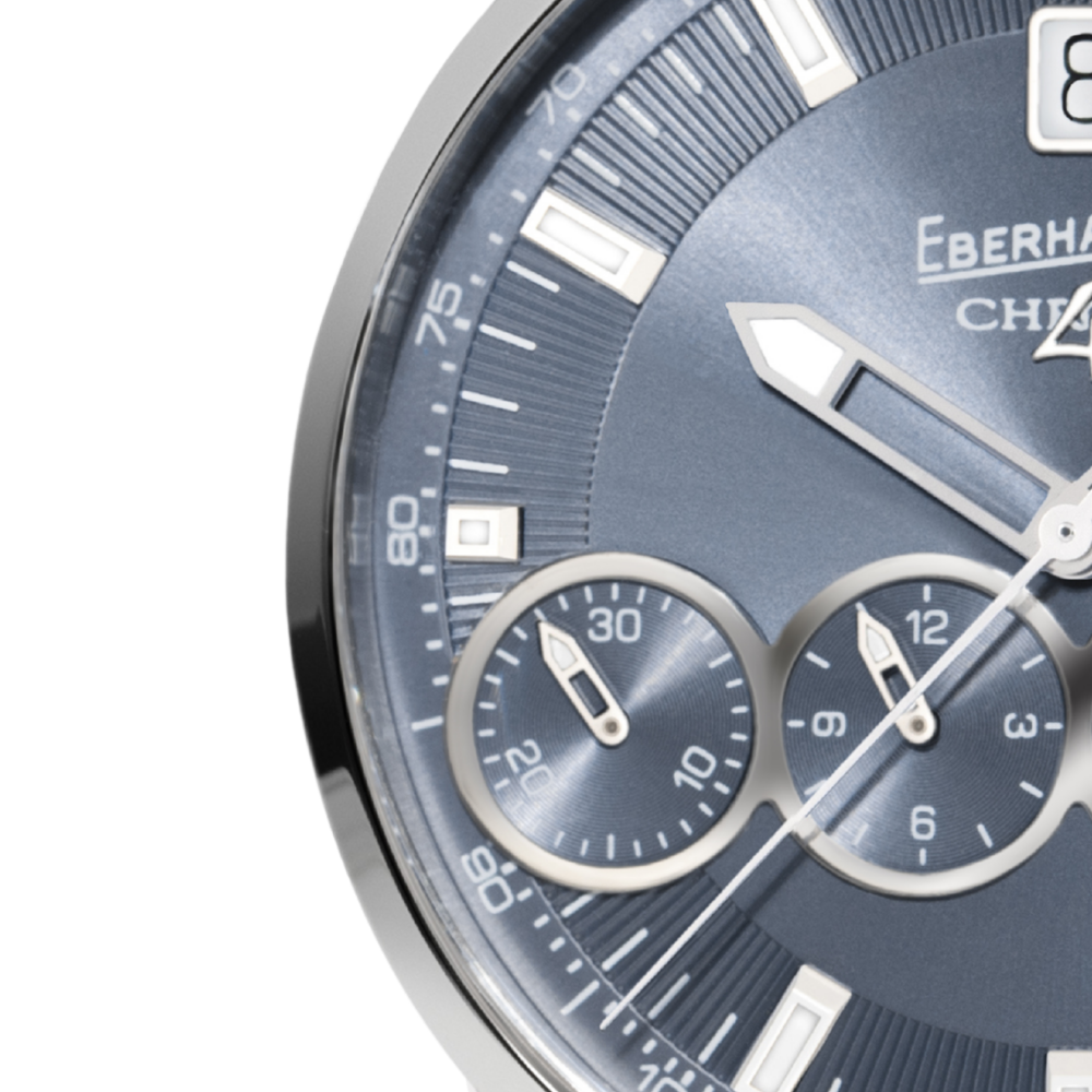 BLUE-GRAY DIAL WITH 4 BLUE-GRAY COUNTERS FEATURING “AZURÉE” FINISHING AND POLISHED APPLIED PROFILE. CENTRAL AREA FEATURING “SOLEIL“ FINISHING, AREA BELOW THE APPLIED INDICES WITH FINELY RADIUS-HEWN WORKING. APPLIED CARVED LUMINESCENT HOUR MARKERS. TACHYMETER SCALE ON BASE 1000.