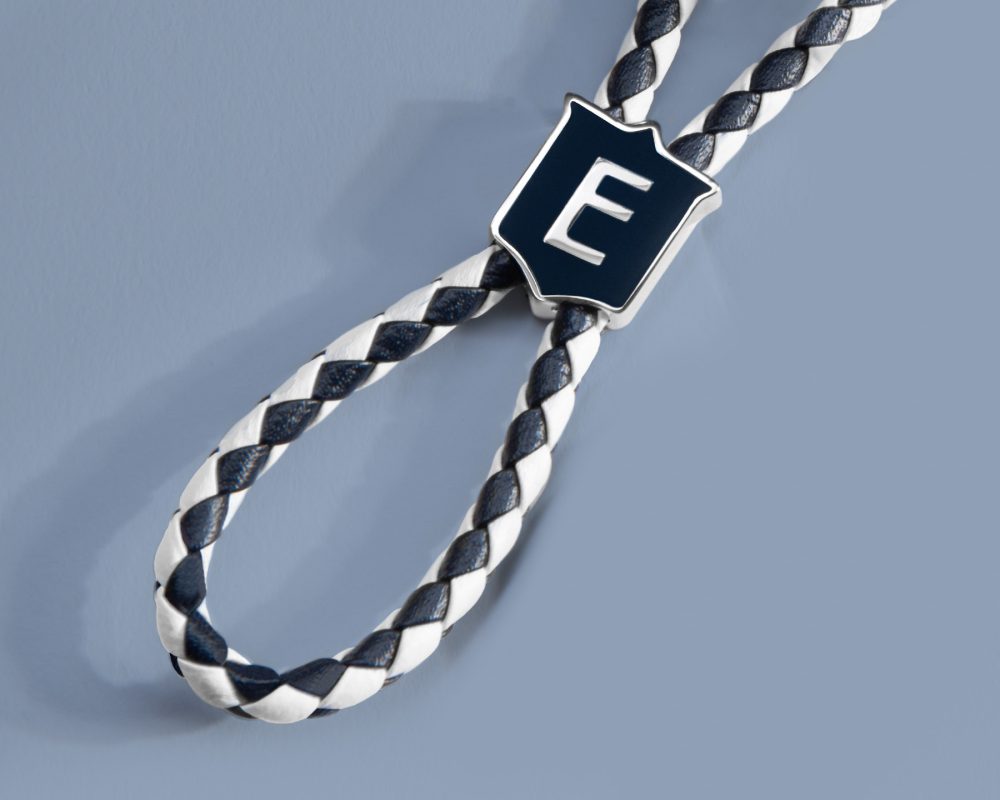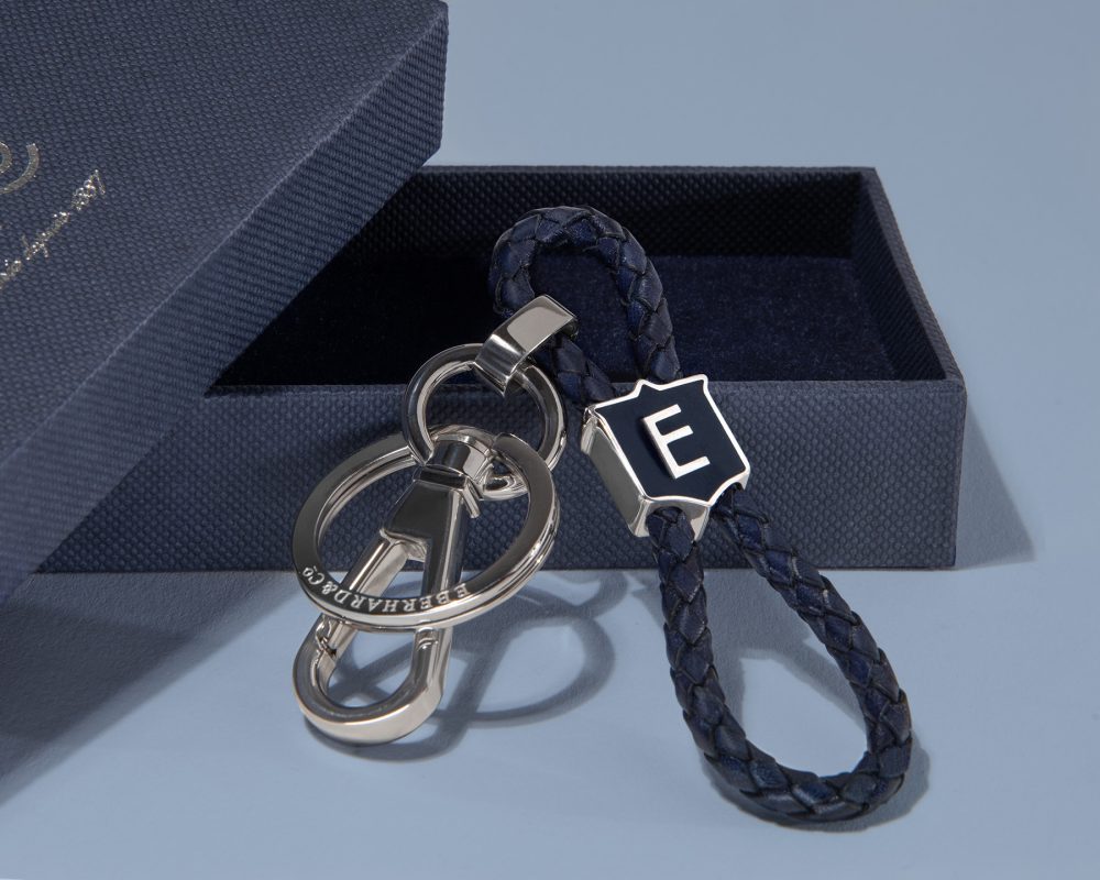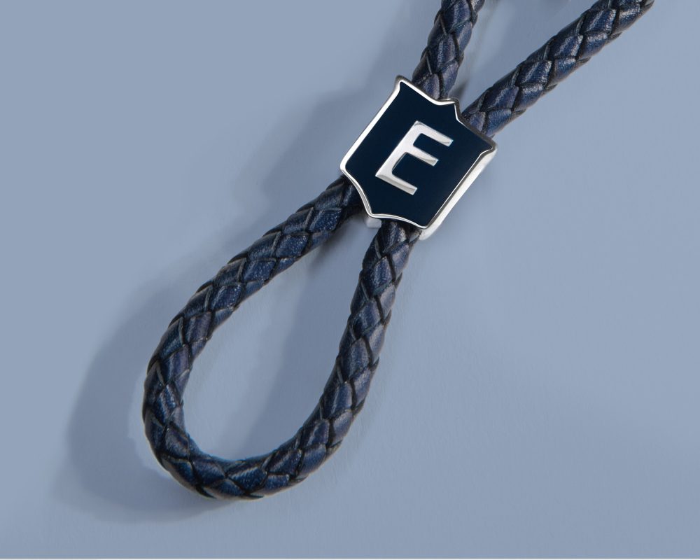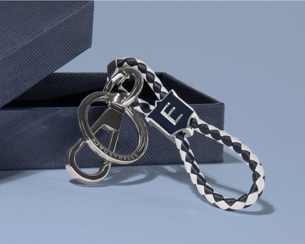 – Braided leather key chain available in two color versions: blue or blue and white