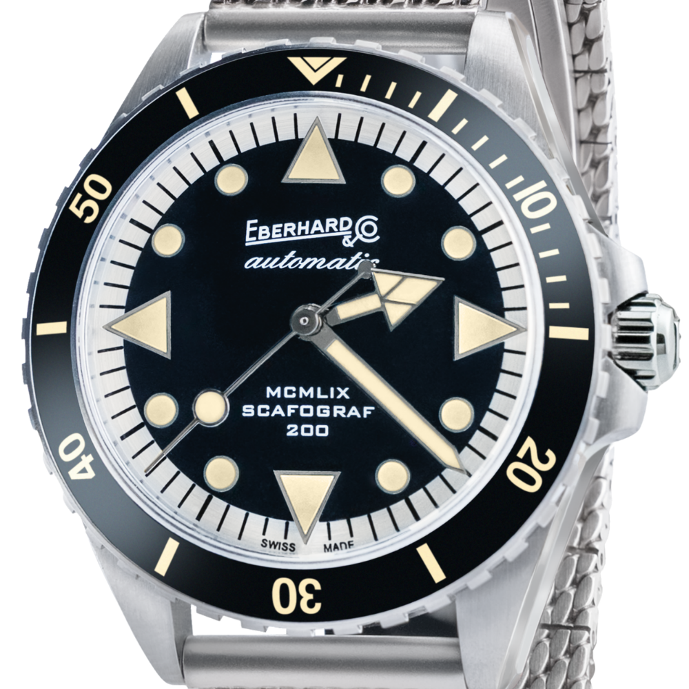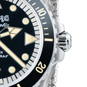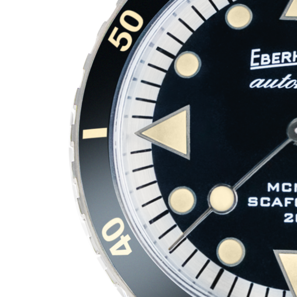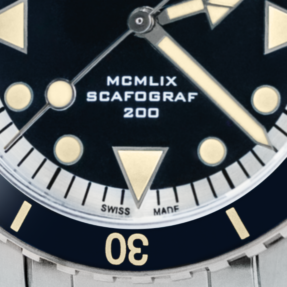 UNIDIRECTIONAL ROTATING BEZEL WITH CERAMIC INSERT AND VINTAGE LUMINESCENT MARKINGS ON THE FIRST 15 MINUTES SCALE