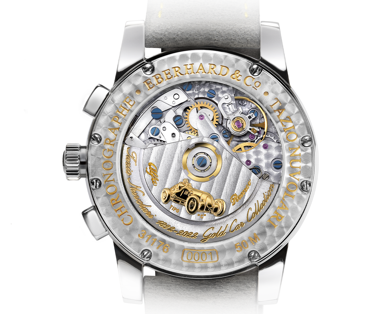 Il cronografo Tazio Nuvolari nella versione “Gold Car Collection” rivela attraverso il fondello in vetro zaffiro il movimento valorizzato da dettagli di grande raffinatezza. La massa oscillante, caratterizzata da una decorazione “Côtes de Genève” e da incisioni dorate, presenta la riproduzione in oro 18 kt di Tazio Nuvolari al volante della leggendaria Alfa Romeo Type C.