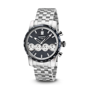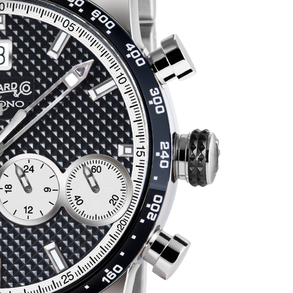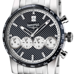 QUADRANTE NERO, 4 CONTATORI BIANCHI CON LAVORAZIONE “AZURÉ” E PROFILO APPLIQUE LUCIDO. PARTE CENTRALE CON LAVORAZIONE “CLOUS DE PARIS”, FASCIA PERIMETRALE CON LAVORAZIONE “AZURÉ” E SCALA DELLA MINUTERIA CON SUDDIVISIONE AL 1/5 DI SECONDO.