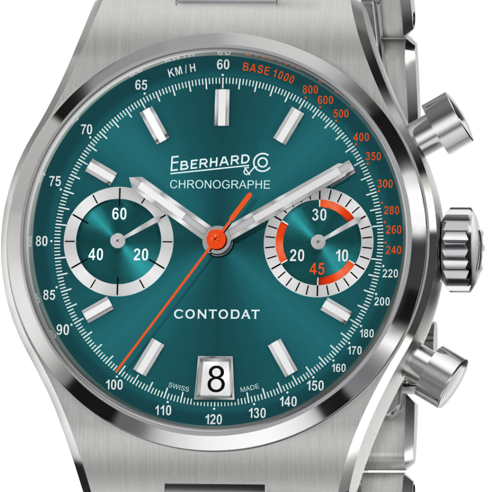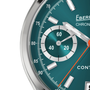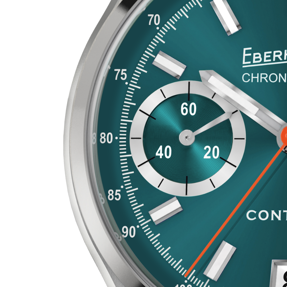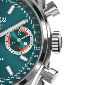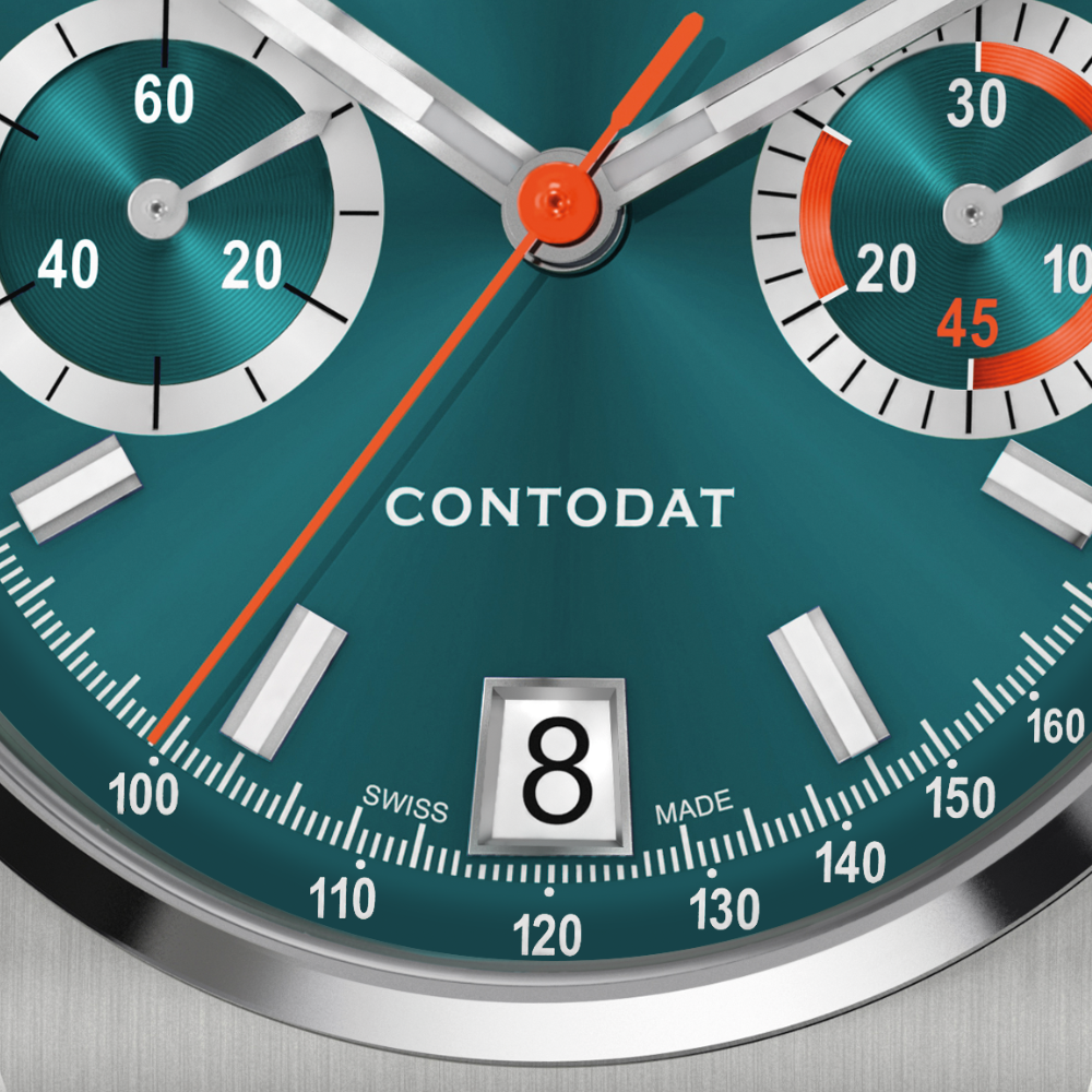 QUADRANTE VERDE CON FINITURA “SOLEIL”. SCALA DEI MINUTI AL 1/5 DI SECONDO. ZONA PERIFERICA SATINATA CON SCALA TACHIMETRICA IN KM/H BASE 1000.